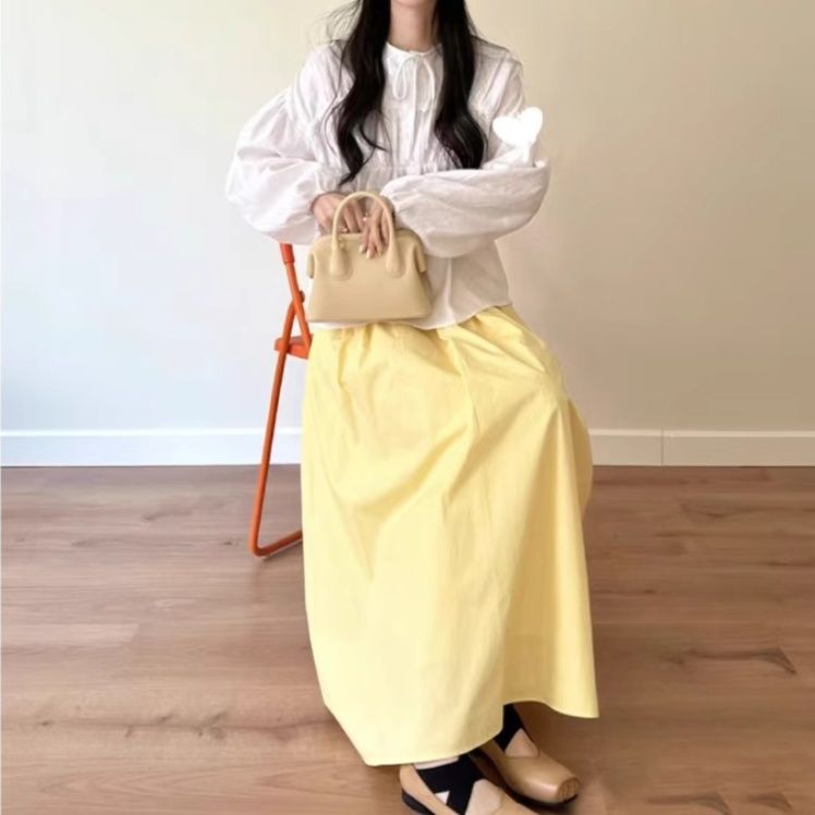 たっぷりとしたギャザーが優雅な動きを演出し、足元まで流れるような美しいラインが特徴です。