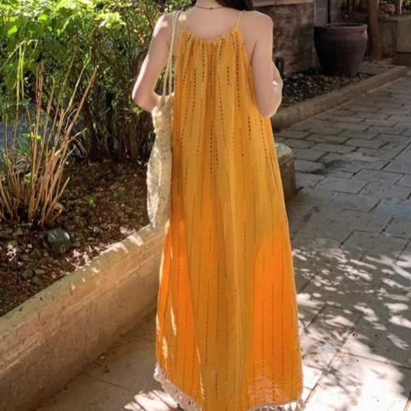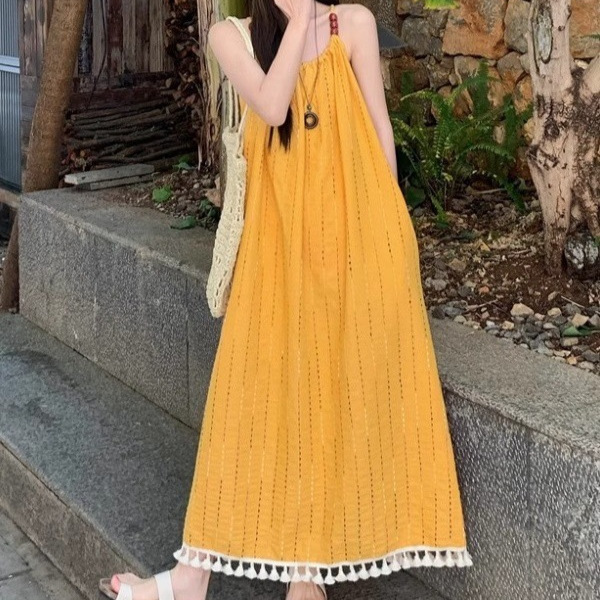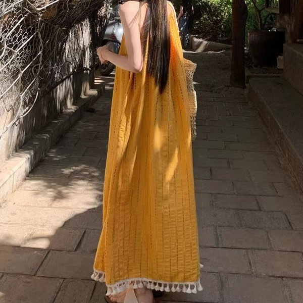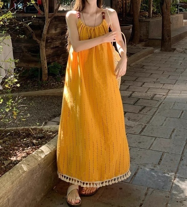 裾にあしらわれた白いタッセルフリンジが歩くたびに揺れて、リゾート気分を盛り上げてくれます。