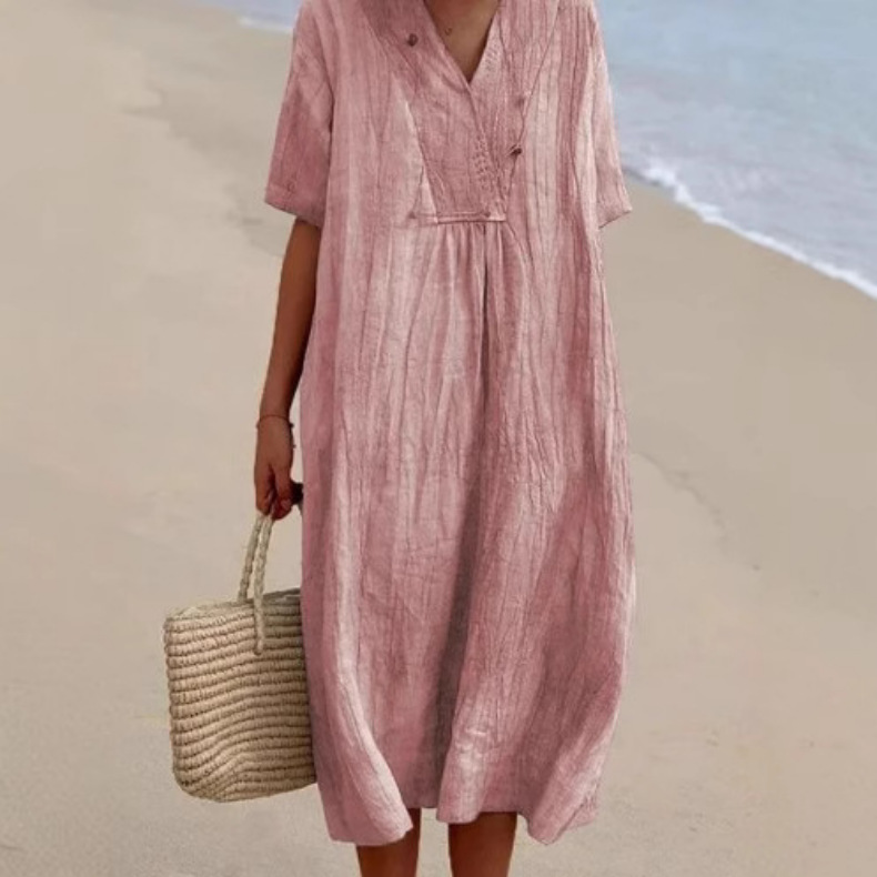 軽やかなリネン風素材が心地よい、きれいめカジュアルなワンピースです。