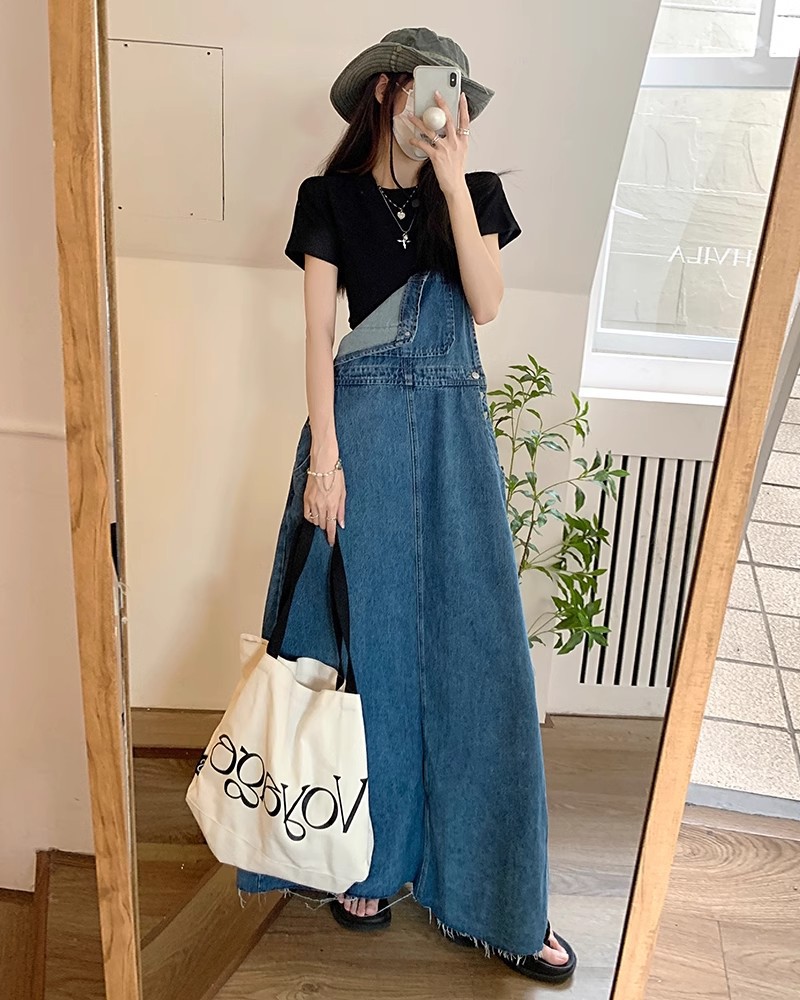 きれいめカジュアルなデニム素材のサロペットワンピースです。