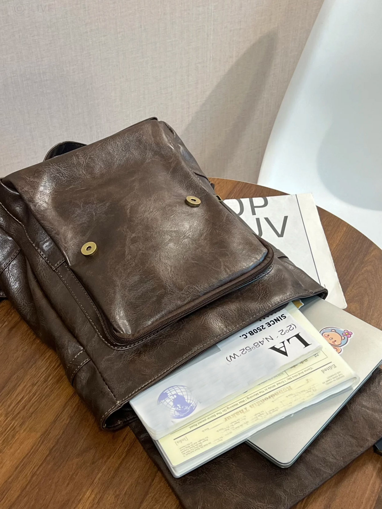 フラップ式の開閉部分と複数のポケットで機能的でありながら、すっきりとした美しいシルエットを保持