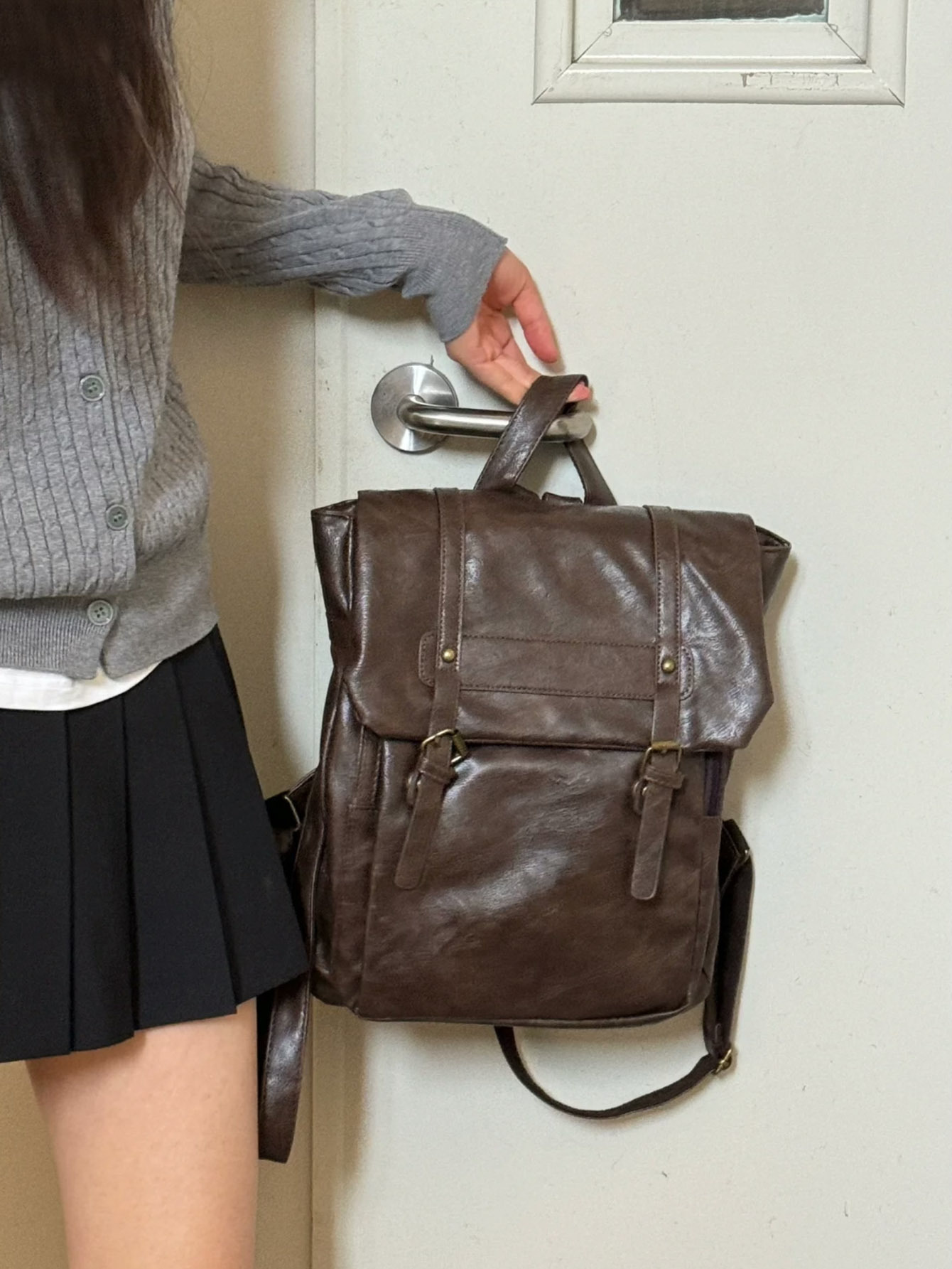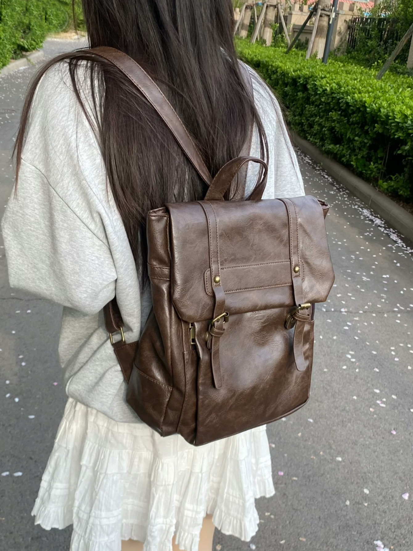 フロント部分の真鍮風バックル金具がヴィンテージライクな魅力をプラスし、洗練されたデザイン性を実現