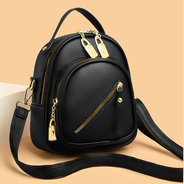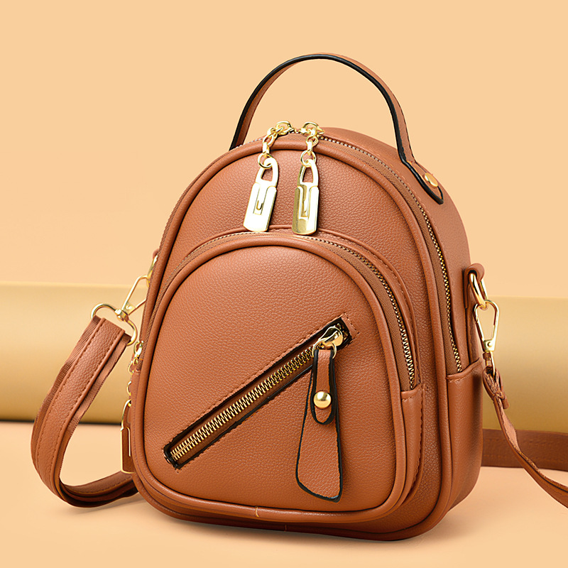 斜めに配置されたファスナーポケットがデザインのアクセントになり、ゴールド金具が上品な印象を演出します。