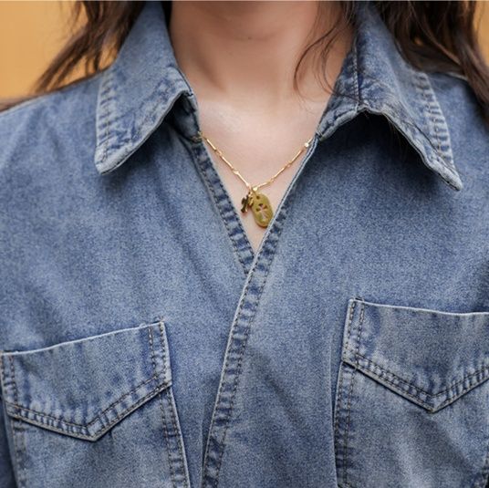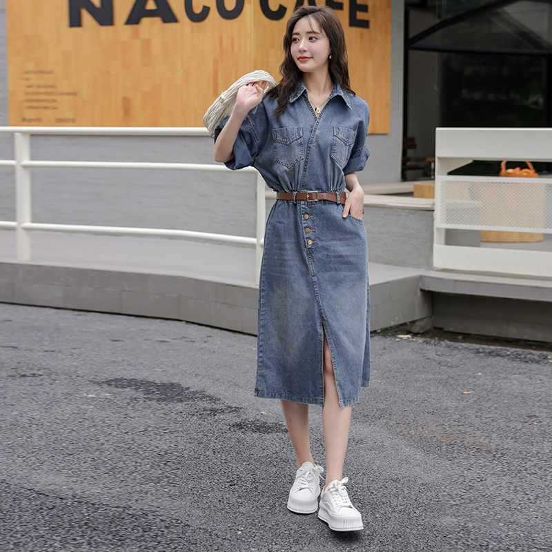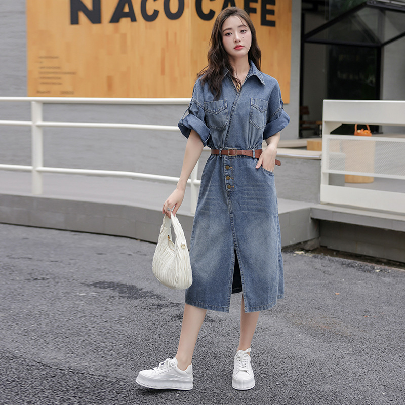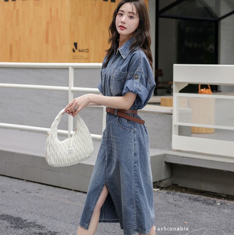 カジュアルながら上品な印象を与えるデニム素材のシャツワンピースです。