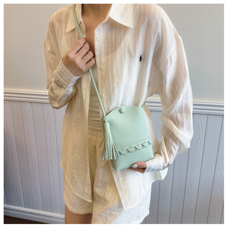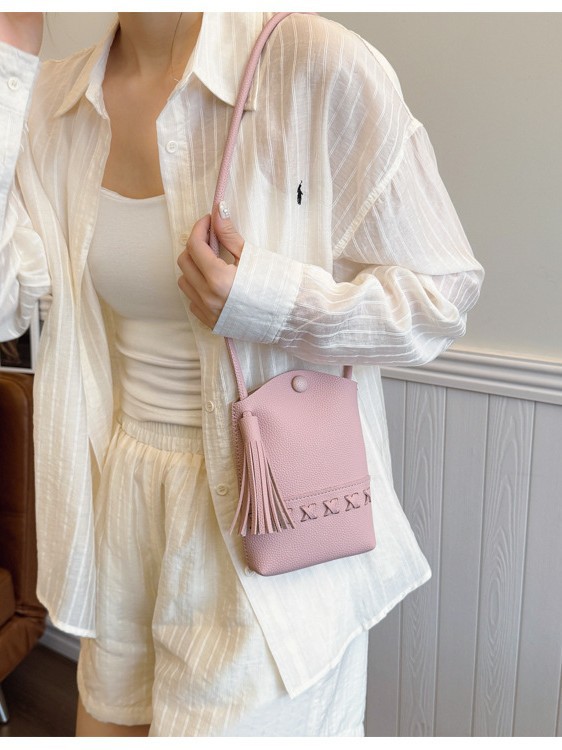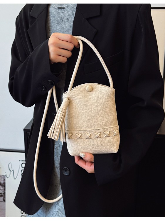 フロント部分に施された立体的な編み込みラインと、タッセル付きの巾着仕様が大人可愛い雰囲気を演出します。