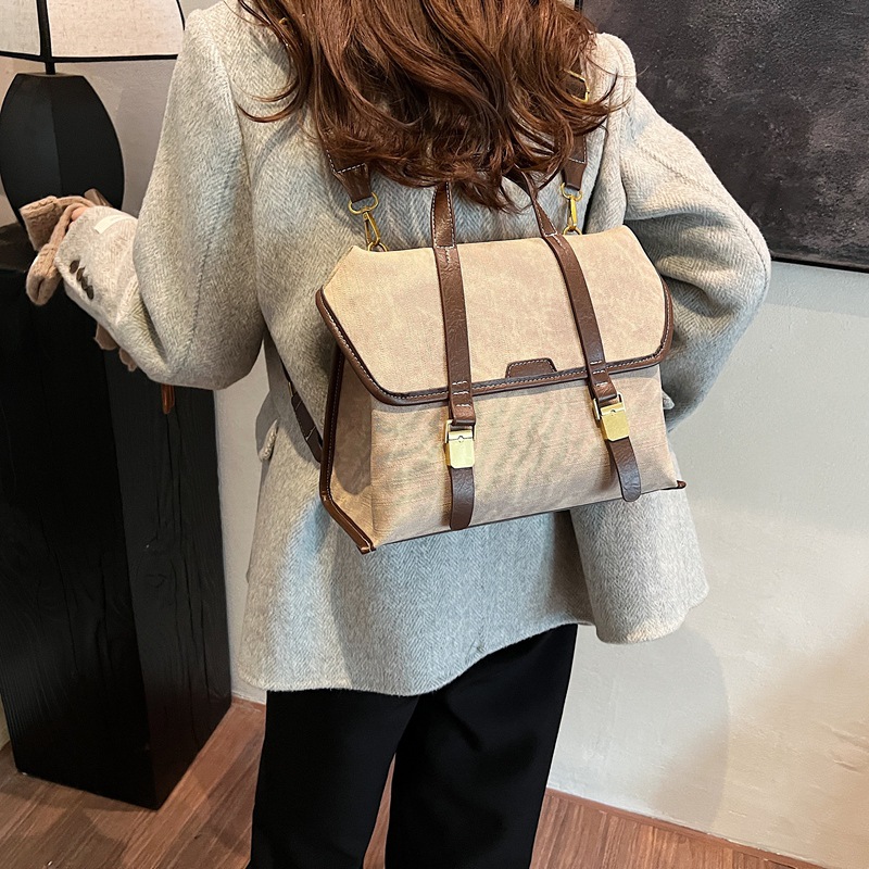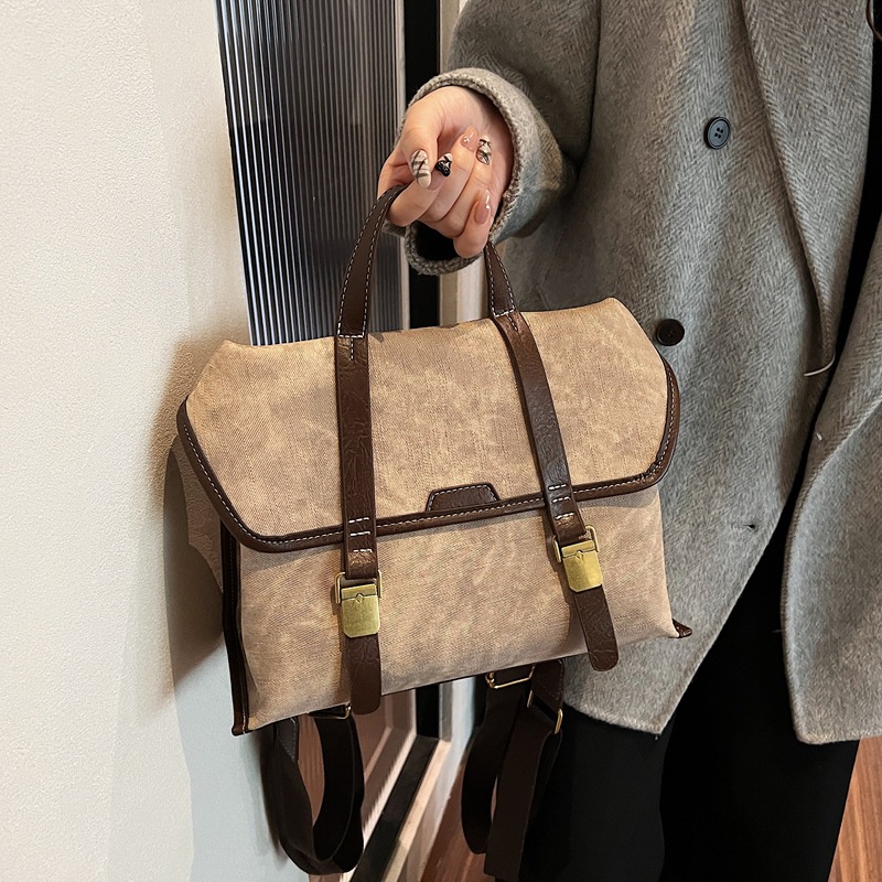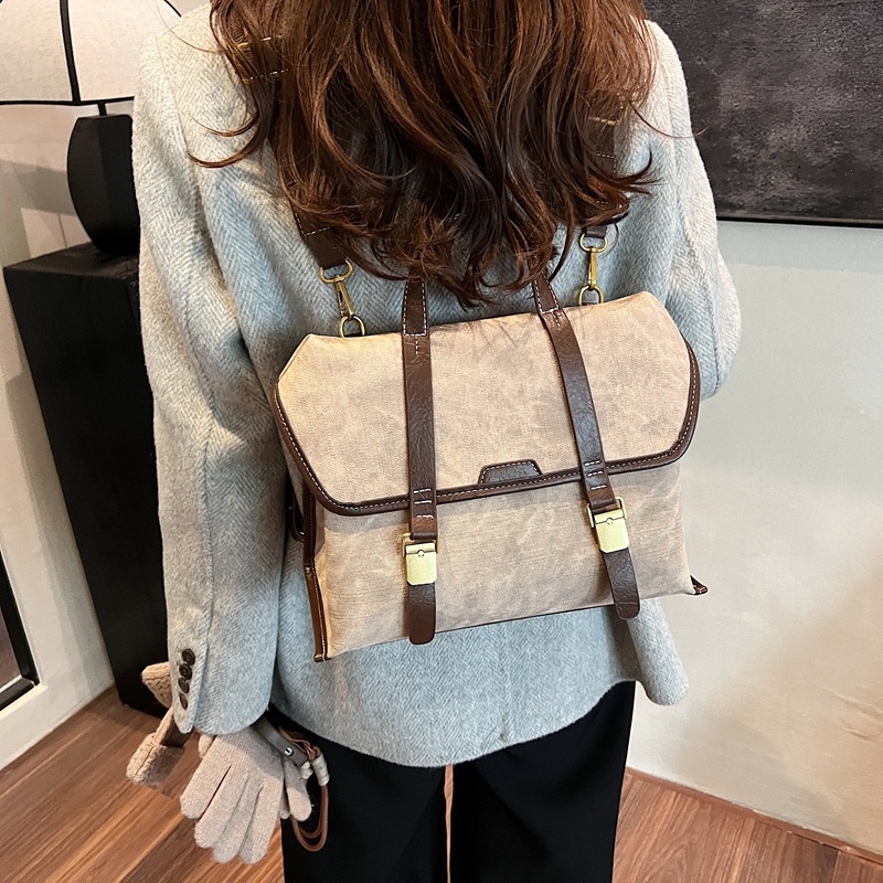 クラシカルな雰囲気漂うキャンバス素材に、レトロな金具とベルトデザインがアクセントの多機能リュックです。