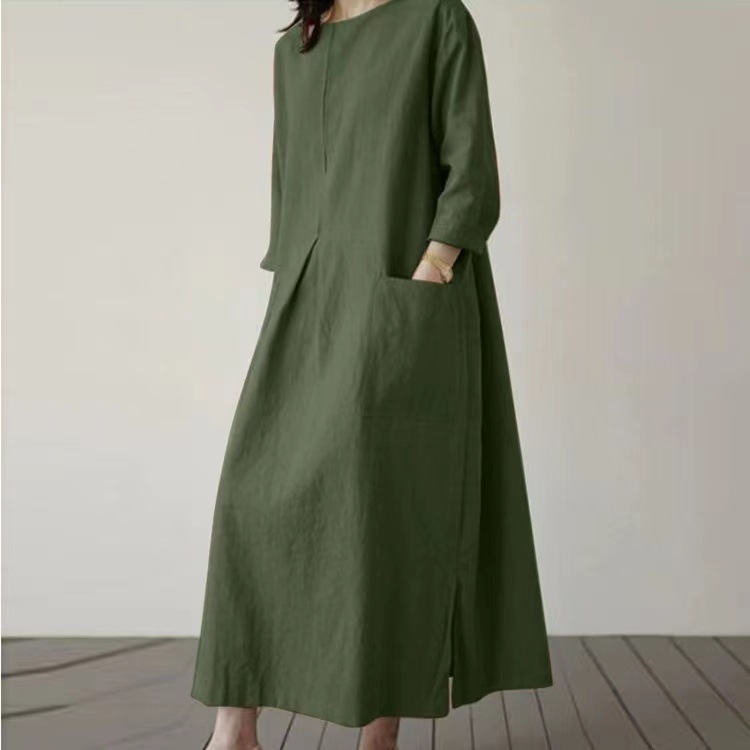 天然素材のような風合いが魅力で、ゆったりとしたシルエットが体型をさりげなくカバーしてくれます。