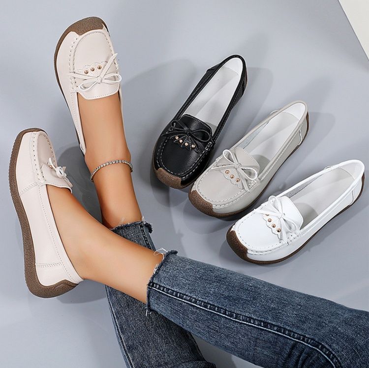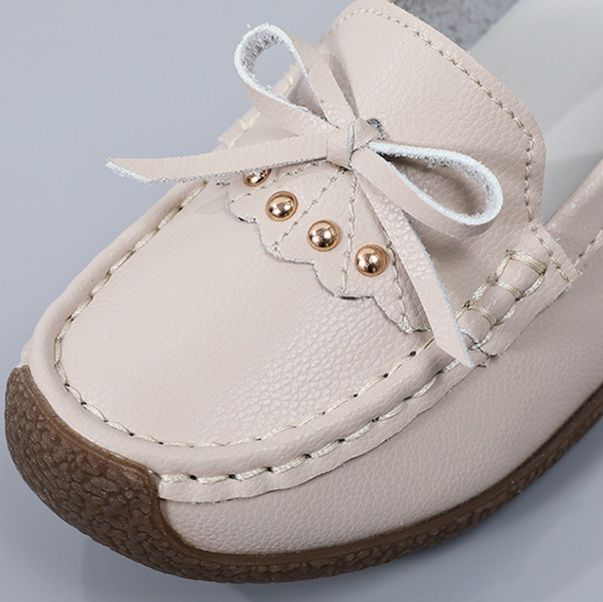 きれいめカジュアルなスタイルにぴったりの、リボンとスタッズで上品に仕上げたモカシンタイプの靴です。