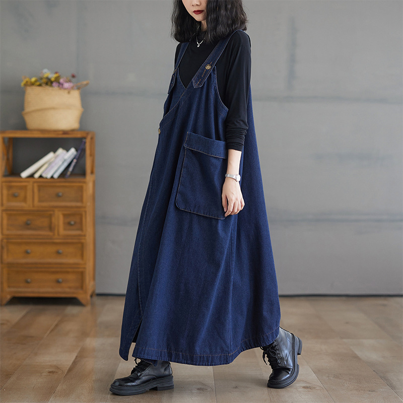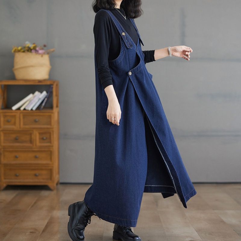 デニム素材のサロペットデザインで、ゆったりとしたシルエットが体型をカバーしながらこなれ感を演出します。