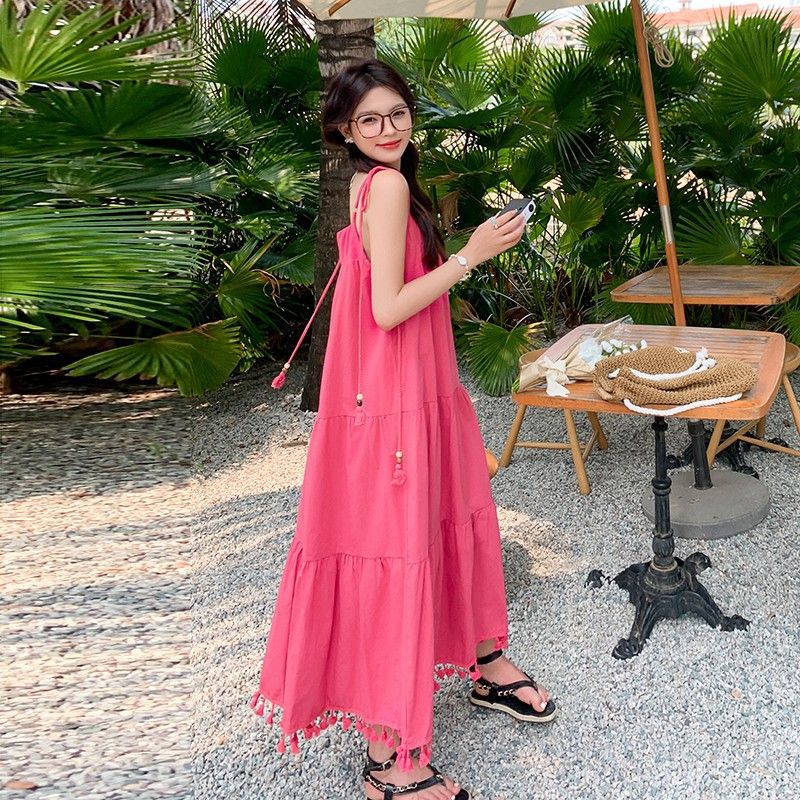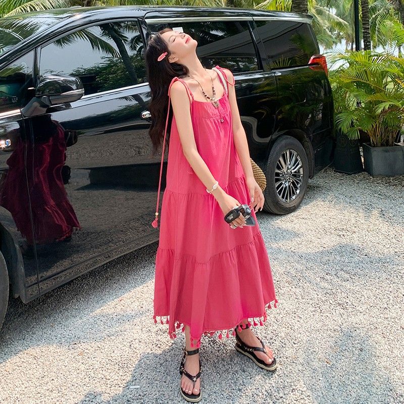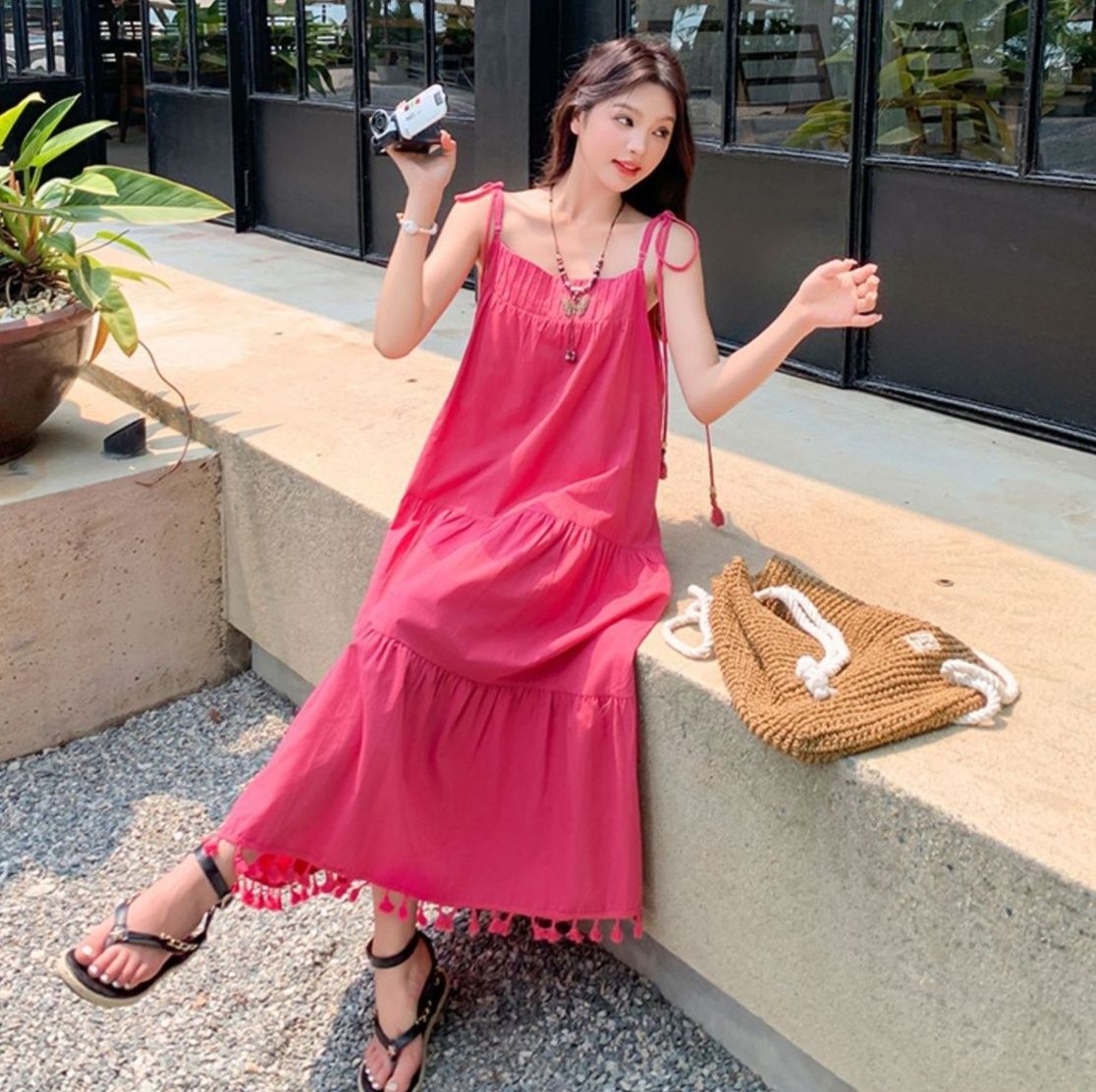 肩紐のリボン結びがフェミニンな印象を演出し、裾のタッセルフリンジがアクセントになっています。