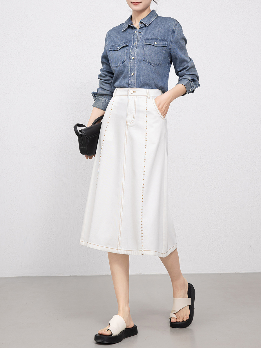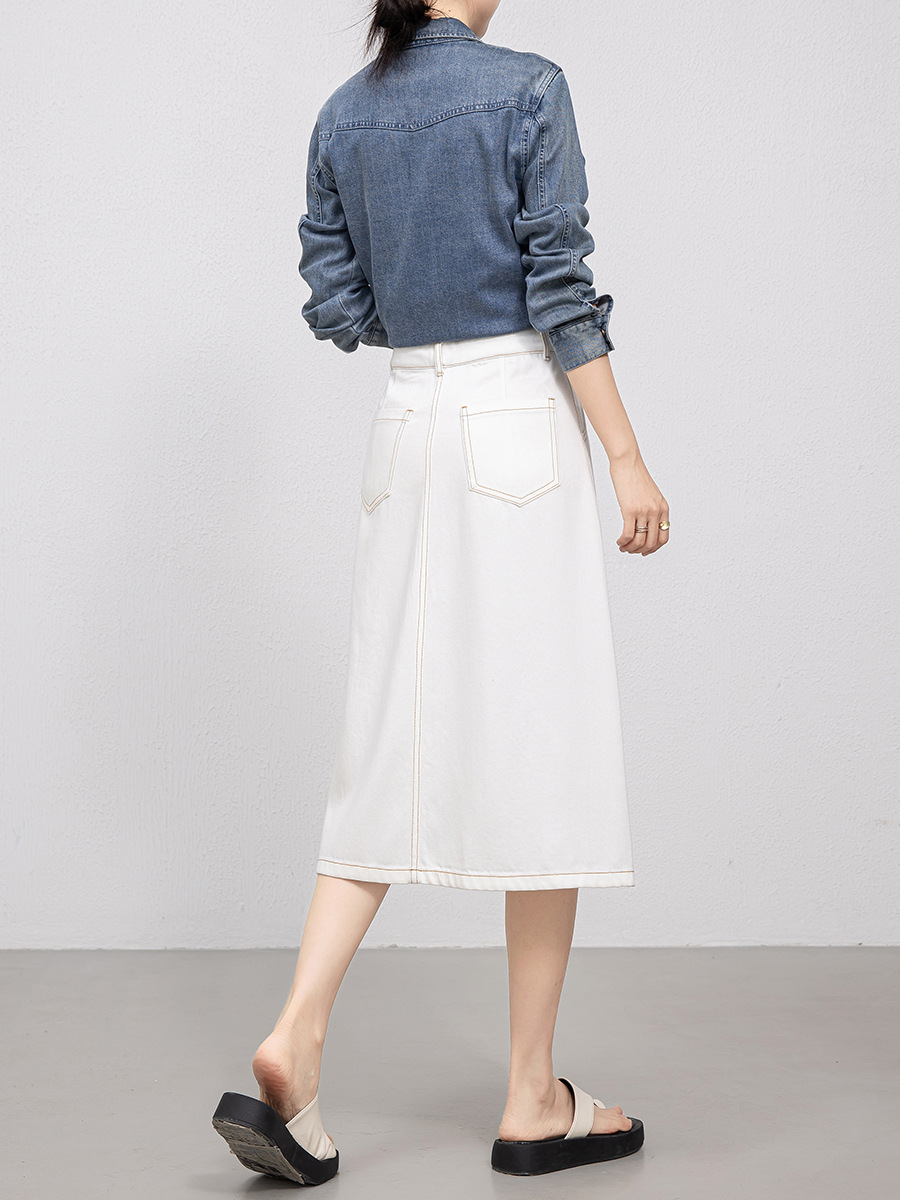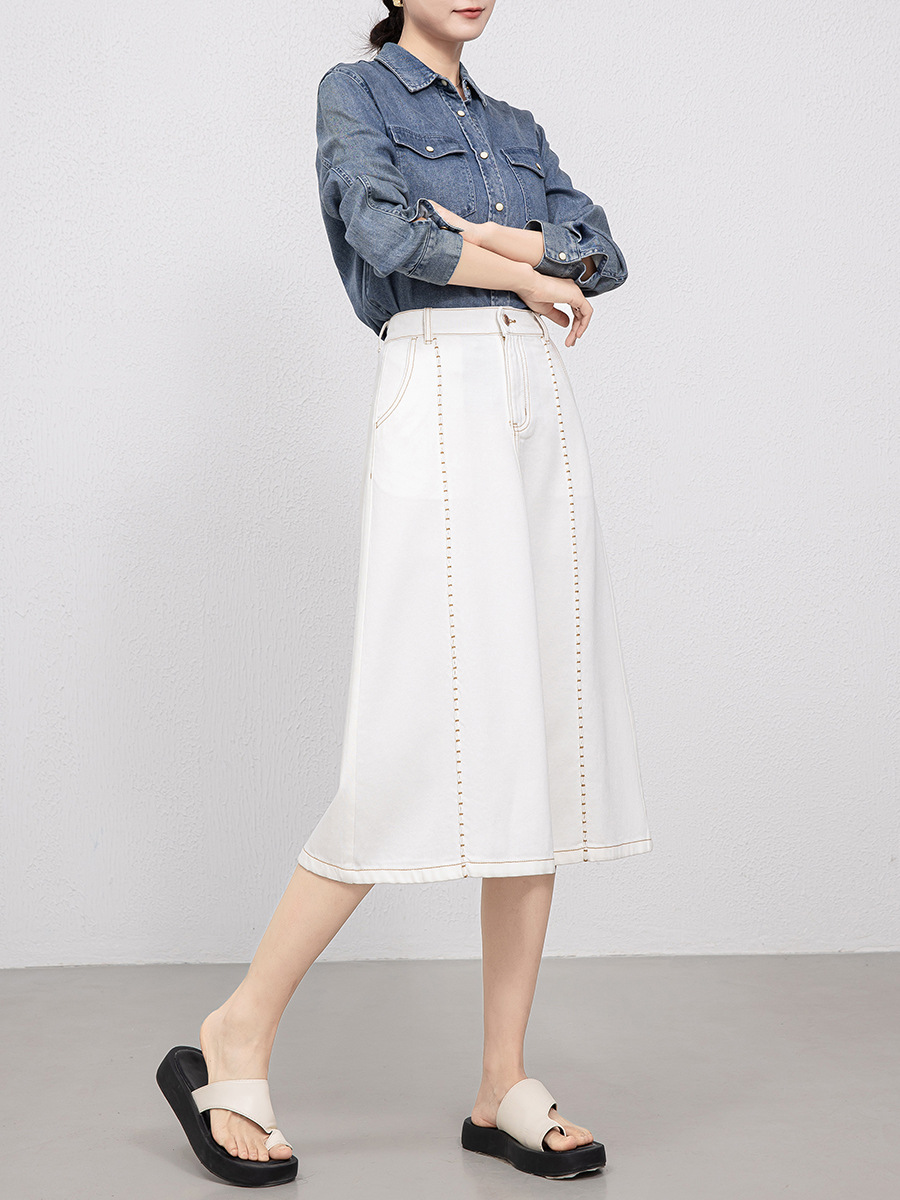 デニムシャツと合わせてカジュアルに、ブラウスと合わせてきちんと感のある着こなしにも対応できる万能なスカートです。