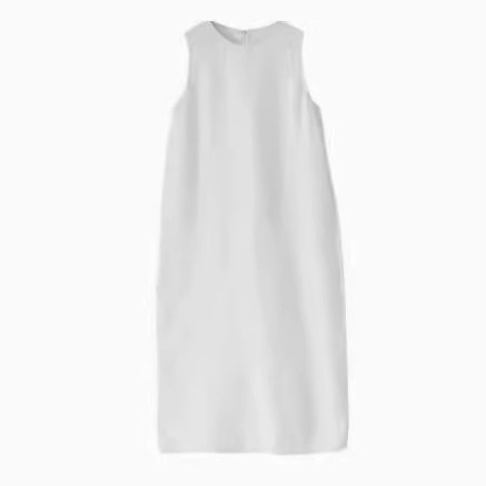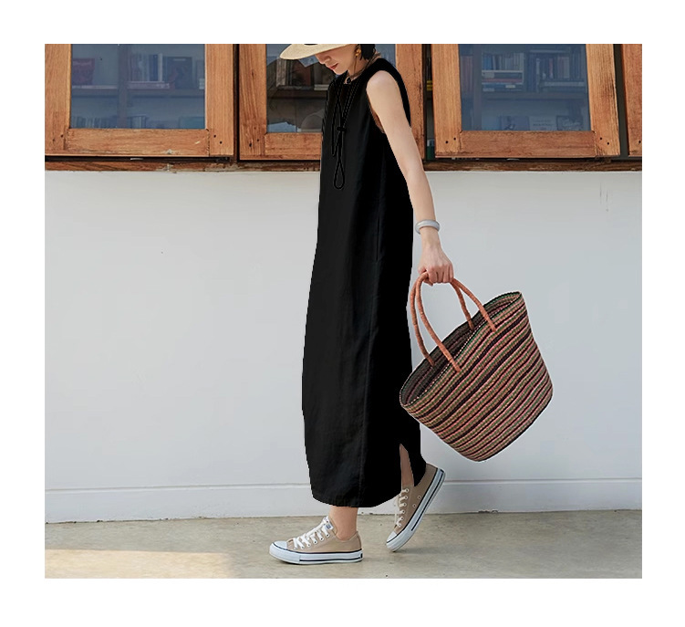 麻混素材で涼しげな着心地を実現し、ロング丈のゆったりシルエットが体型をカバーしながらリラックスした雰囲気を演出します。