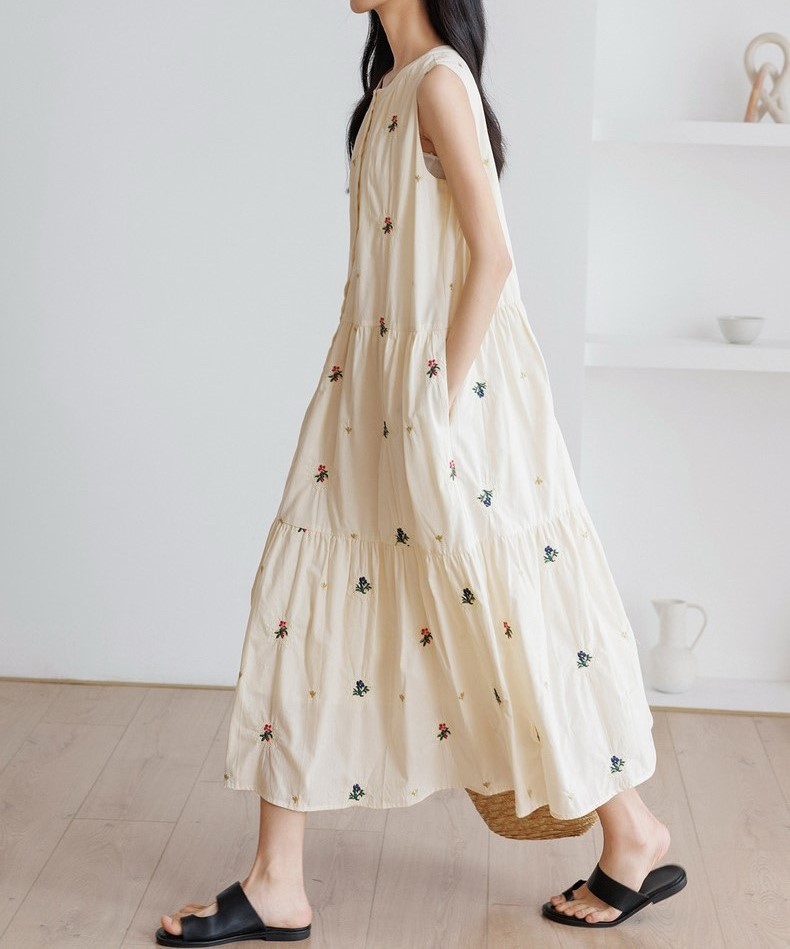 可憐な小花刺繍が全体に散りばめられた、ノースリーブワンピースです。