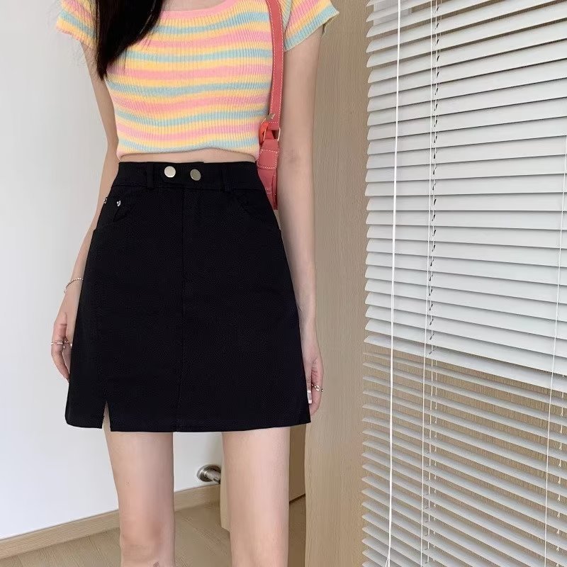 フロントのダブルボタンがアクセントになった台形シルエットのスカートです。