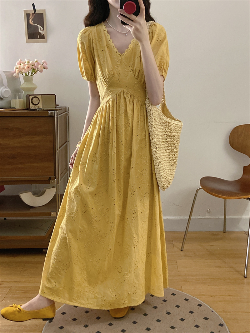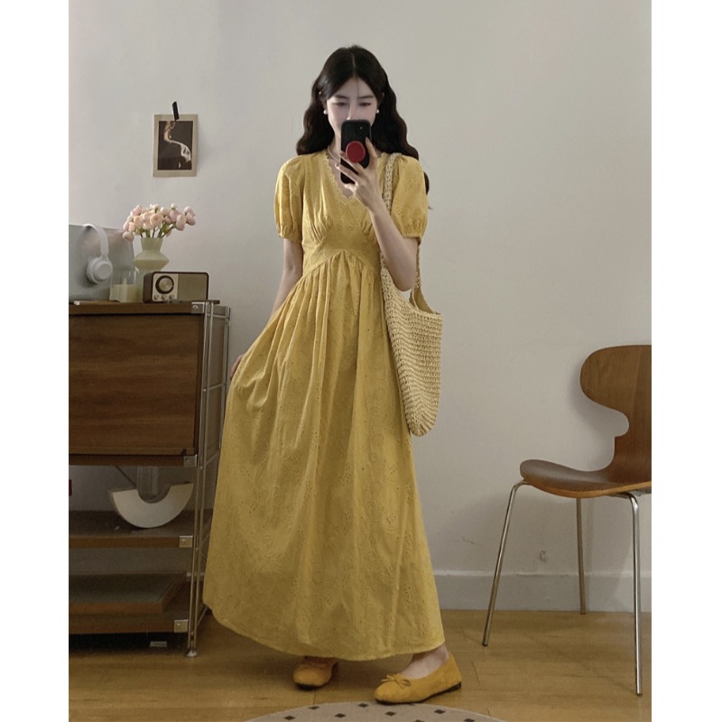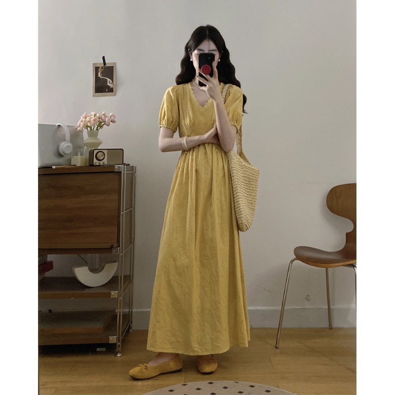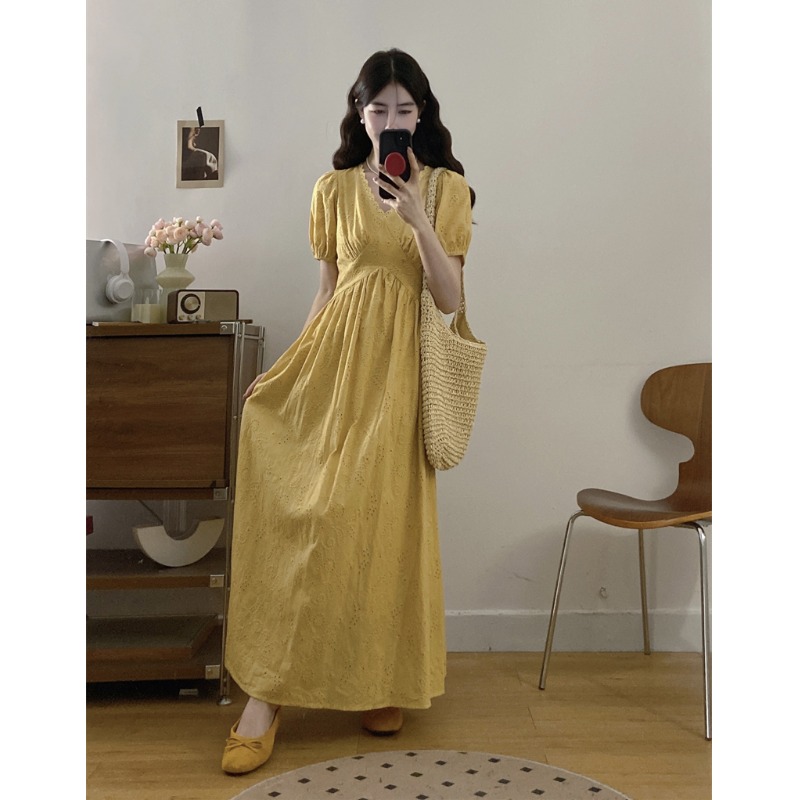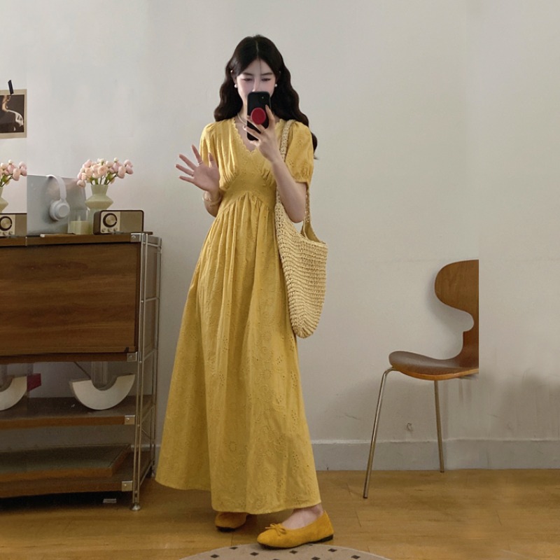 ふんわりとしたパフスリーブと高めのウエスト切替が女性らしいシルエットを演出するワンピースです。