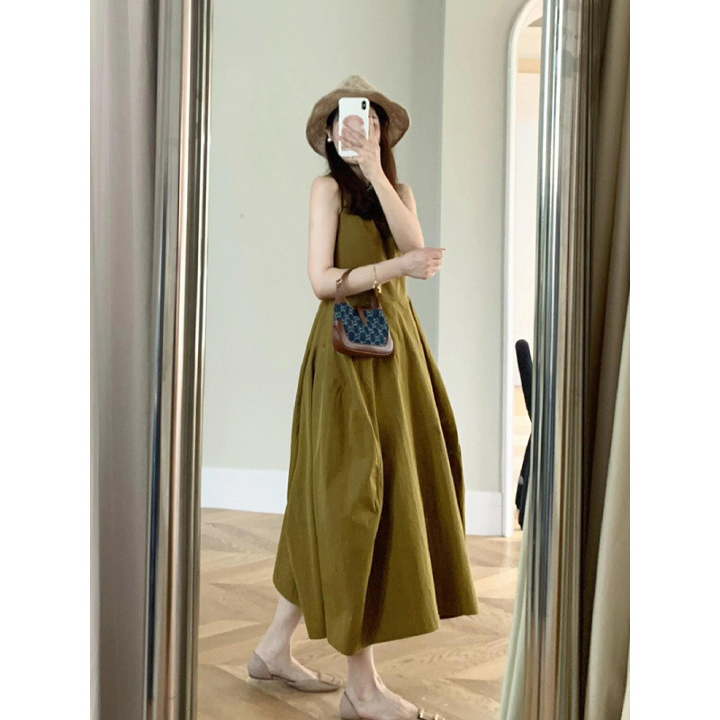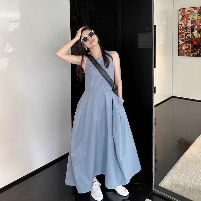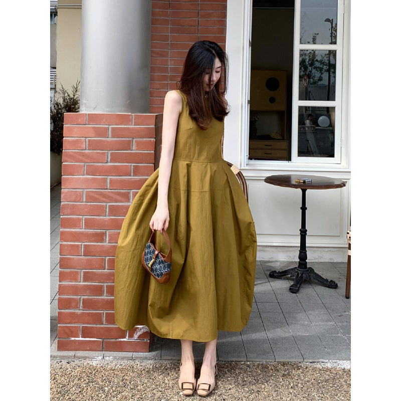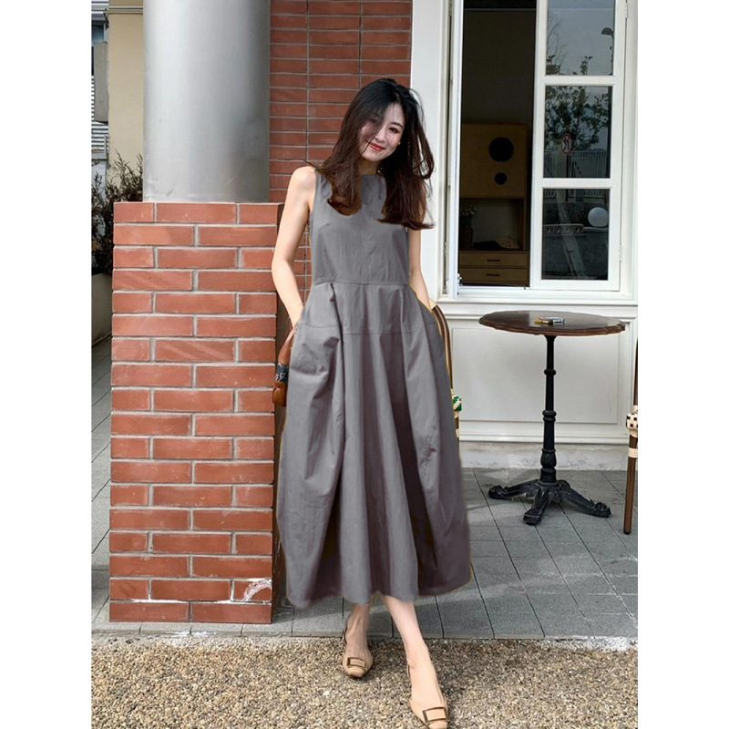 ノースリーブデザインですっきりとした印象を与え、ウエストから広がるバルーンシルエットが女性らしいシルエットを演出します。