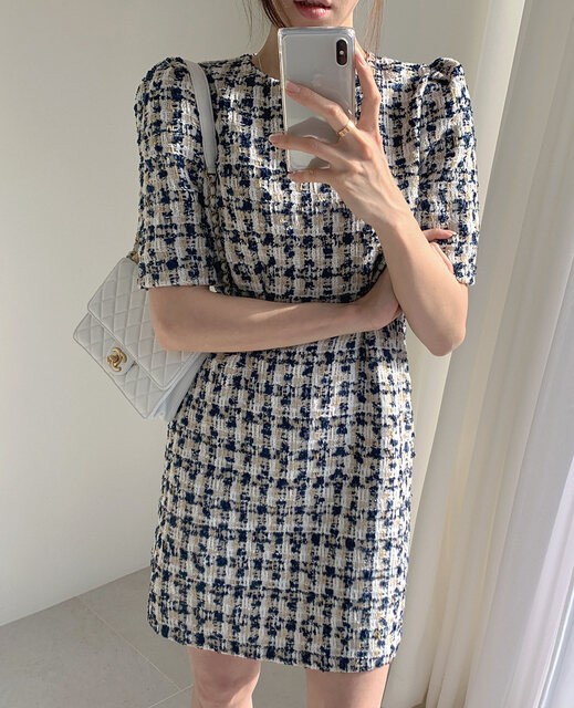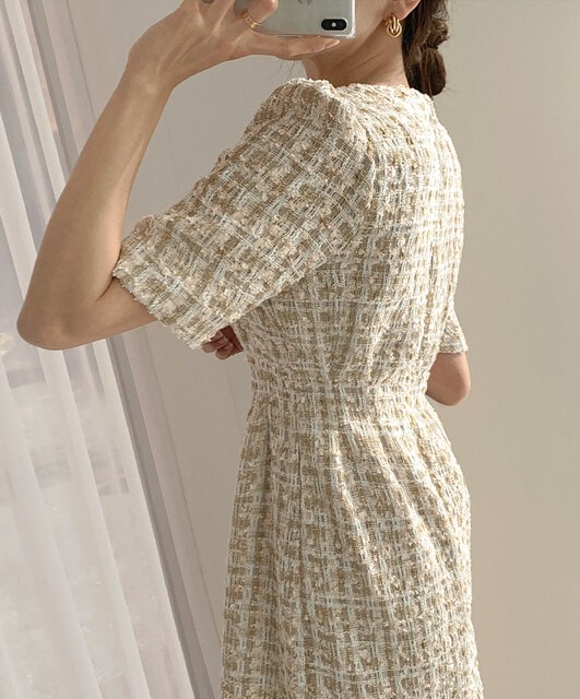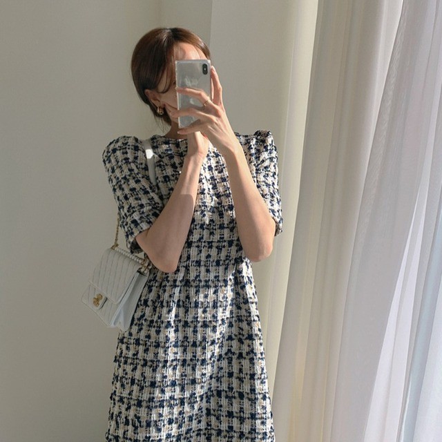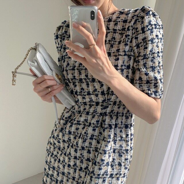 きれいめカジュアルな印象を演出するツイードワンピース。