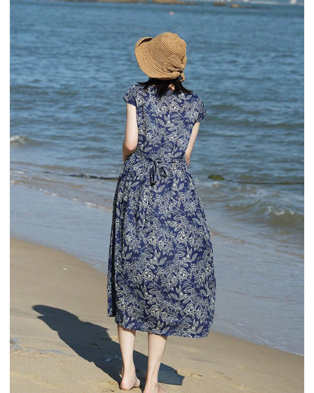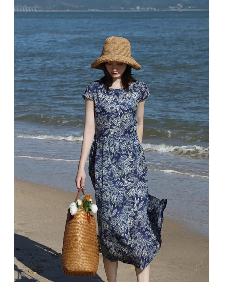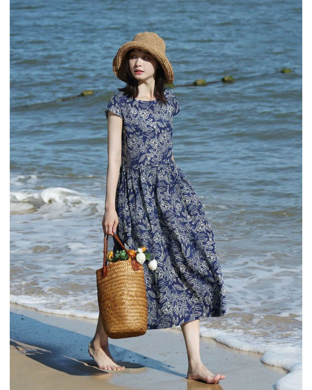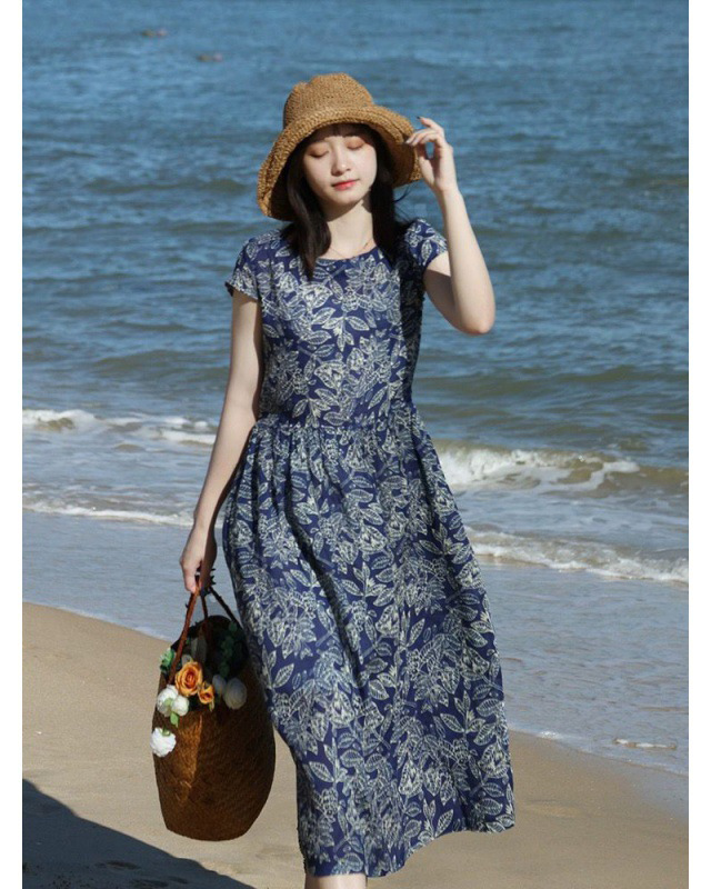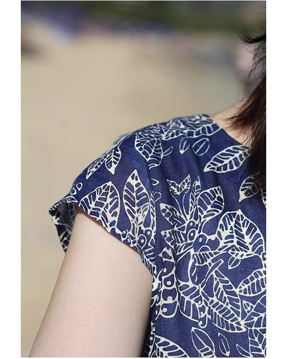 上品なネイビー地に美しい花柄が映える、きれいめカジュアルな一着です。