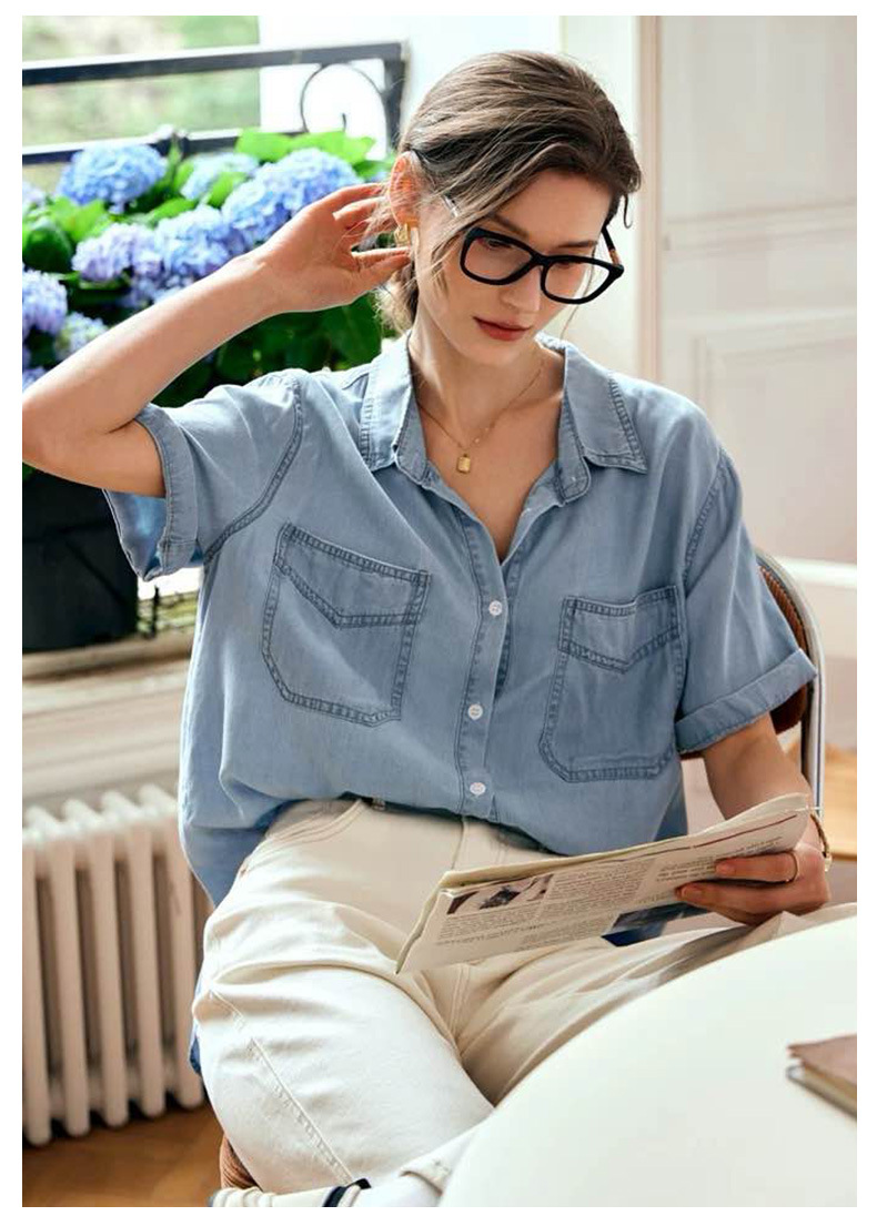 胸元のダブルポケットがアクセントになった半袖デニムシャツです。
