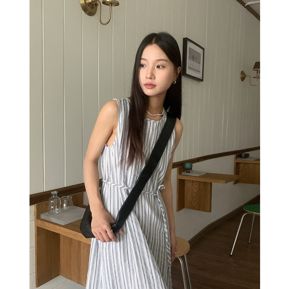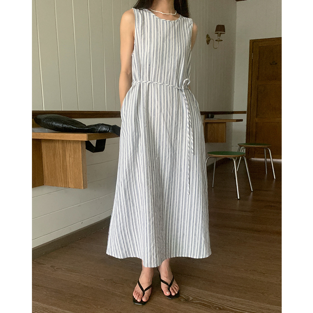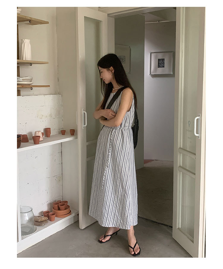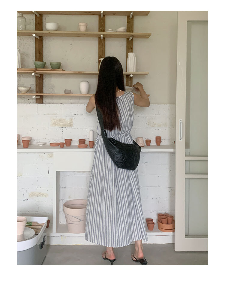 涼しげな縦縞柄が爽やかな印象を与えるノースリーブワンピースです。