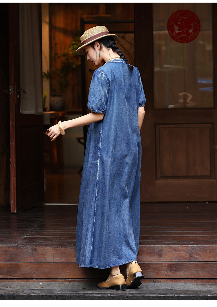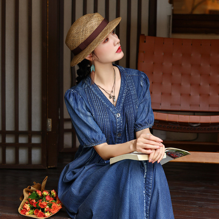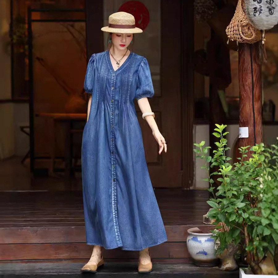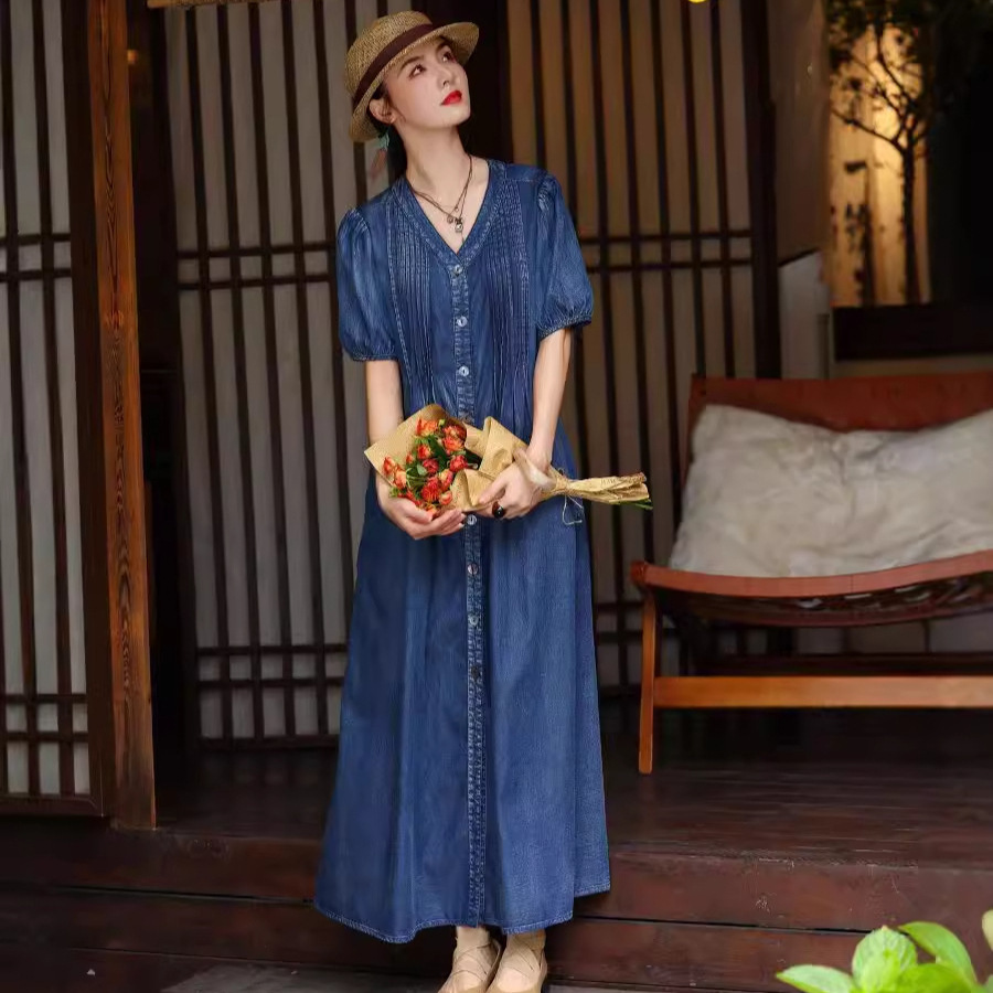 繊細なピンタックと刺繍が胸元を上品に彩るデニム素材のワンピースです。
