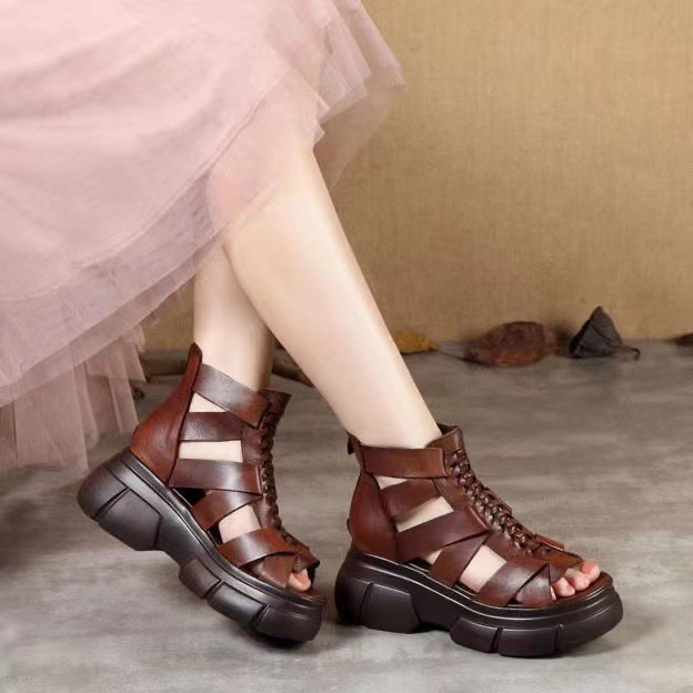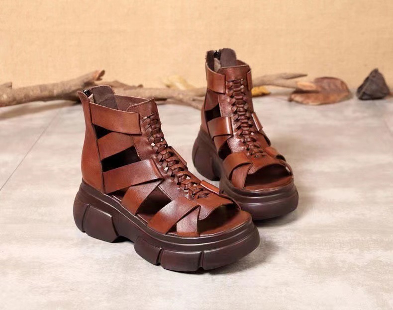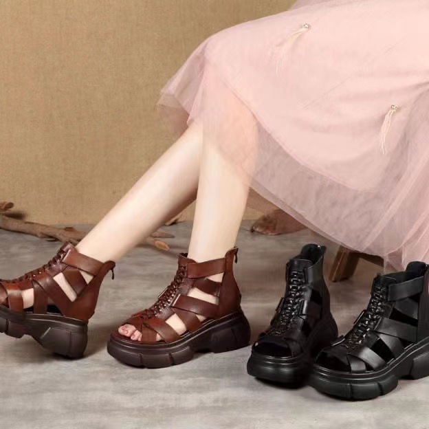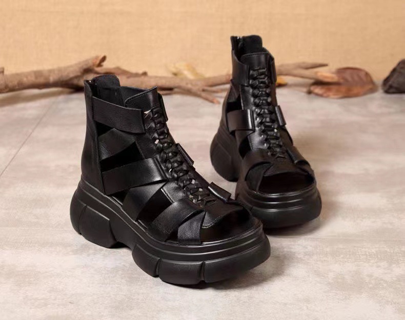 個性的なデザインが目を引く厚底サンダルブーツです。