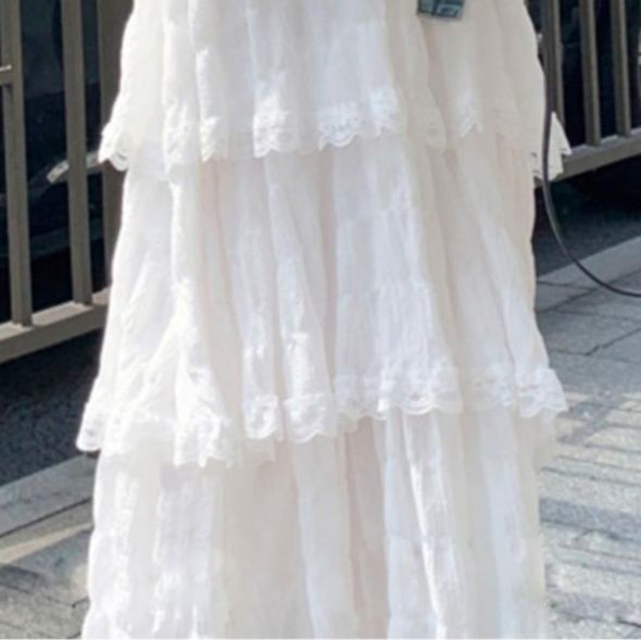 段々に重なるティアードデザインが、歩くたびに優雅に揺れて華やかな印象を与えます。